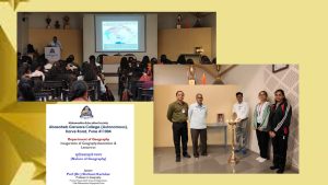 Activities-Department of Geography always puts extra efforts on academic improvement of students by conducting the various activities like guest lectures, study tours and visits. A visit to the various academic institutes is a part of syllabus hence teachers and student visit to Indian Meteorological Department, Pune, Agricultural Exhibitions and geographical interested places around the Pune. In each academic year department conducts long and short study tour/field excursion. “Remedial Coaching Programme” for SYBA and TYBA Geography students and IIRS outreach programs department has conducted. This programme is sponsored by National Natural Recourses Management System (NNRMS), Indian Institute of Remote Sensing (ISRO). Department has conducted “Certificate Course in Travel and Tourism”. Geography department also celebrate Geography Day (Bhugol Din).
