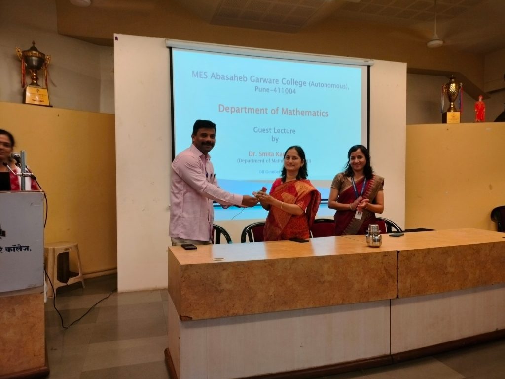 Inauguration of Mathematics Association and Guest Lecture by Dr. Devendra Shirolkar: The Department of Mathematics, Abasaheb Garware College (Autonomous), Pune, organized the Inauguration of the Mathematics Association followed by an enlightening guest lecture on Saturday, 2nd August 2025.The event featured Dr. Devendra Shirolkar (M.Sc., Ph.D. Mathematics), Assistant Vice President, Deutsche Bank, who delivered an engaging talk highlighting the practical relevance of mathematics in the banking and finance sector. He shared valuable insights into mathematical modelling, data-driven decision making, and the evolving role of mathematicians in industry.The programme began with the formal inauguration of the Mathematics Association, aimed at fostering academic growth, encouraging student participation, and promoting mathematical thinking through various activities throughout the year.
